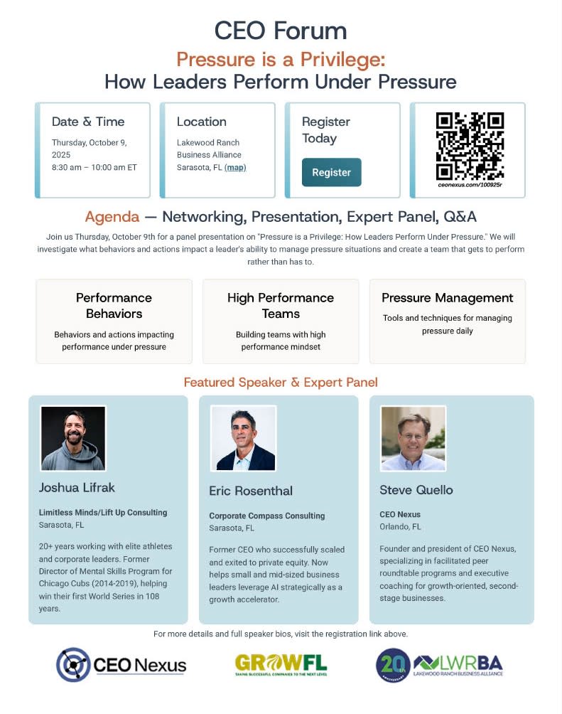 Join us in Lakewood Ranch for breakfast and a demonstration of the GrowFL CEO Nexus Roundtable Program. This experience provides an inside look at CEO Roundtables, revealing how they work and inviting you to explore the possibility of joining this exclusive community of leaders. Including a featured speaker TBD.Images